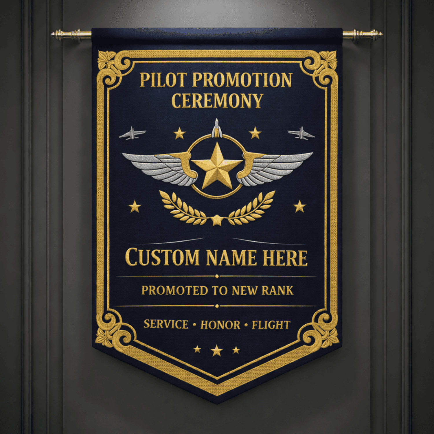 Pilot promotions represent years of training, dedication, and exceptional performance. This banner provides a meaningful visual tribute to those accomplishments while creating a memorable centerpiece for the promotion ceremony.